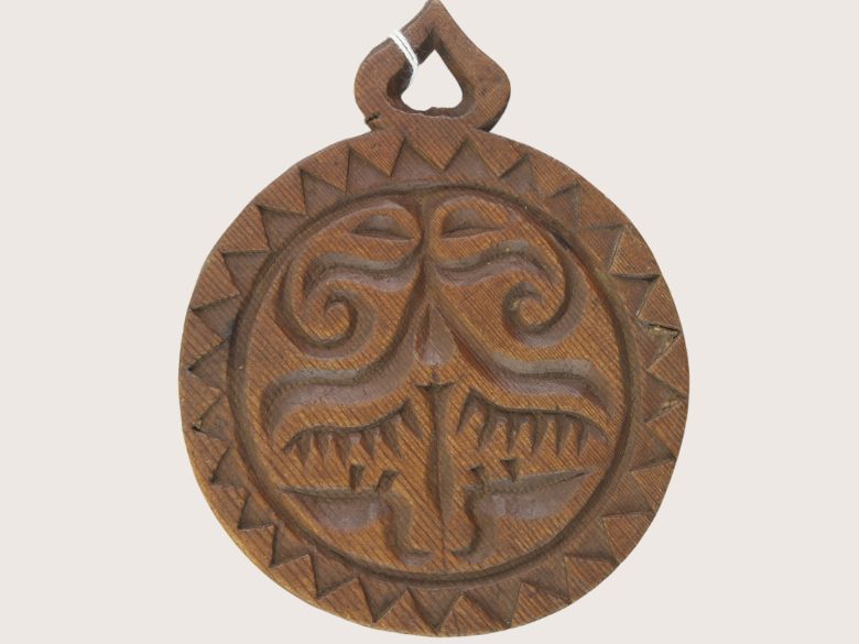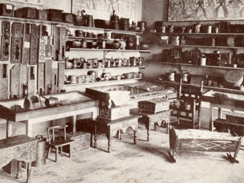 Pictured: An early display of peasant arts woodwork and a carved butter stamp from Iceland