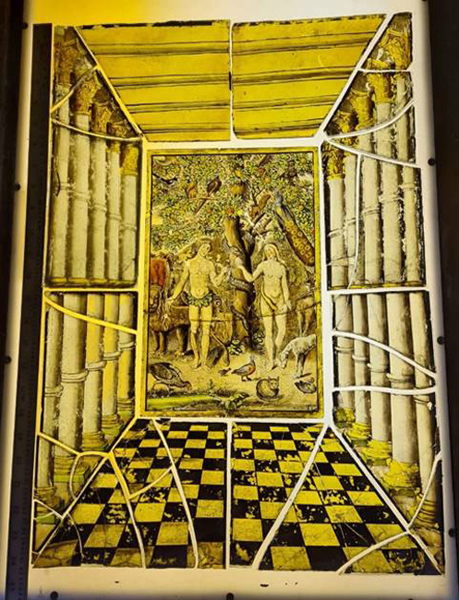 The restorer was able to un-glue the central pictures but some of the surrounds were so badly splintered it was not possible for them to be un-glued.
