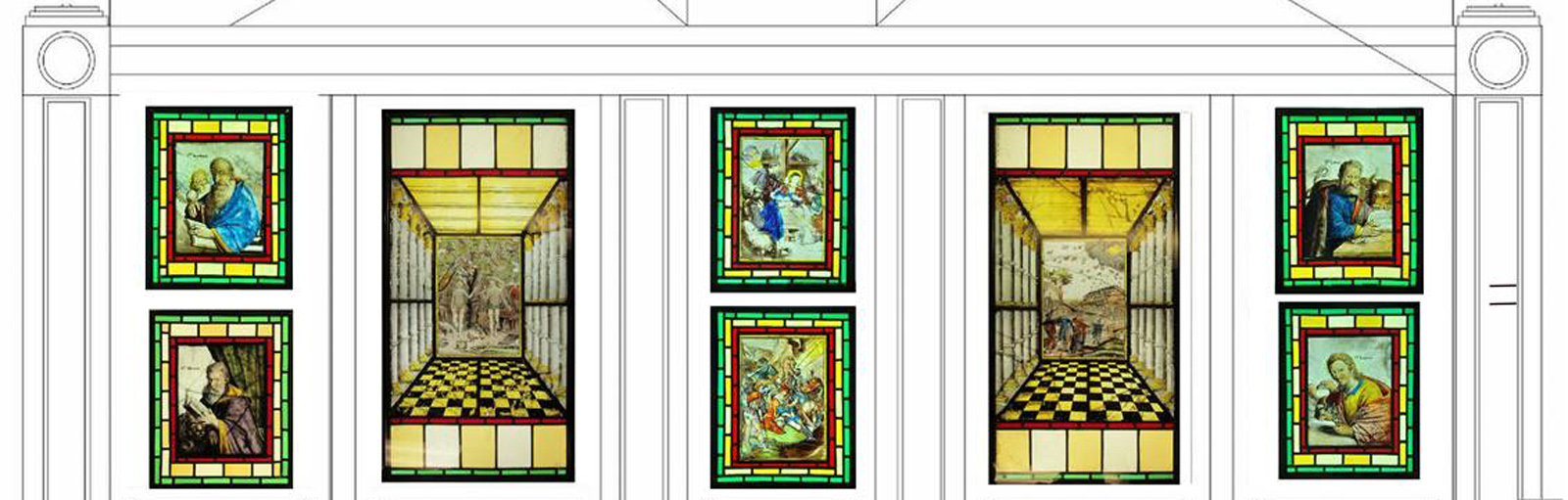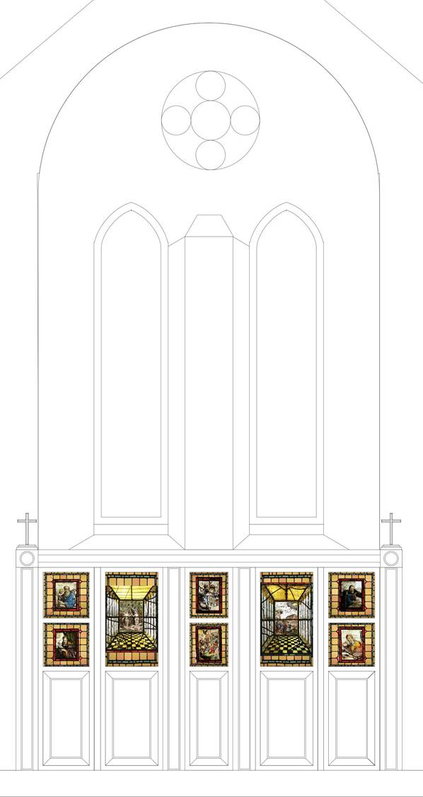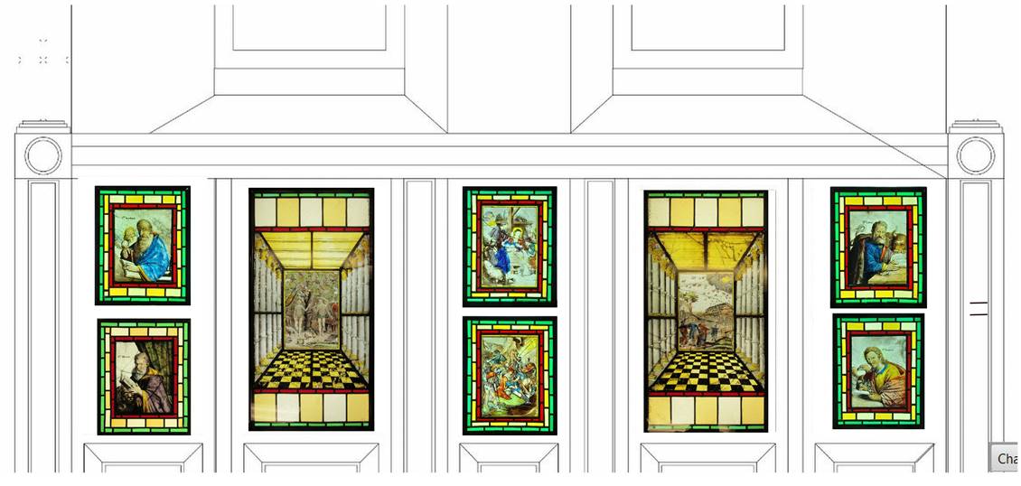The glass panels will be displayed in a custom built cabinet, back-lit with LED (daylight) lighting panels. The two larger panels will line up with the west windows above