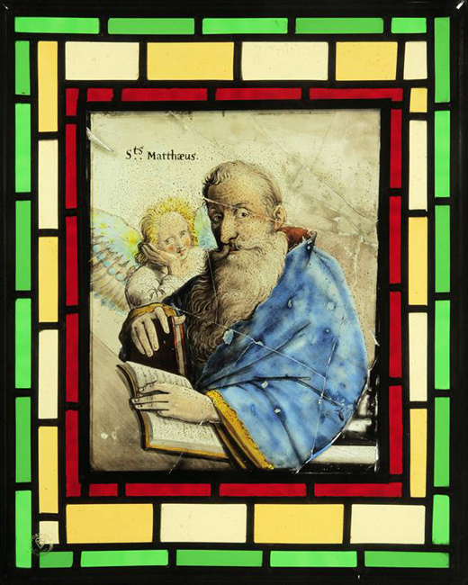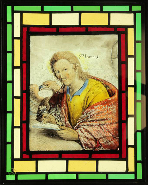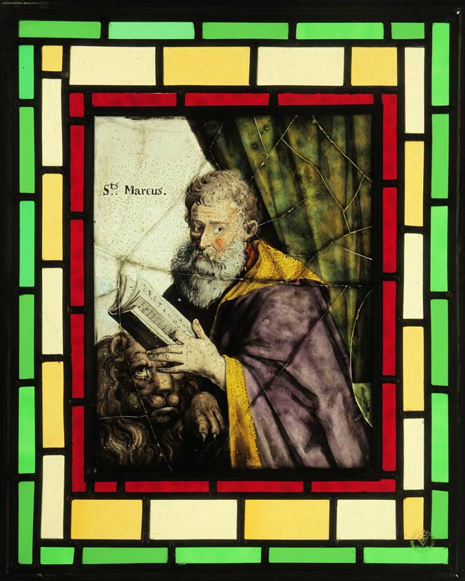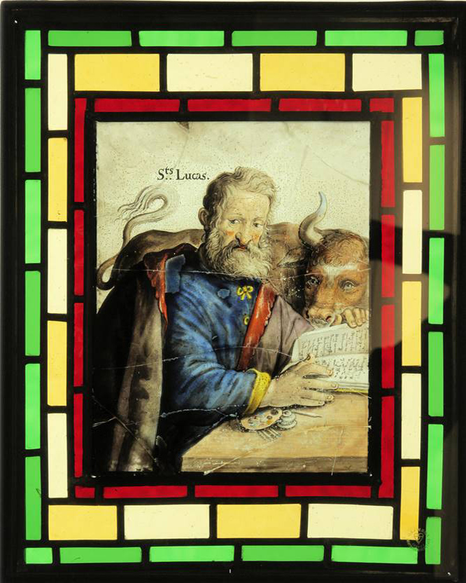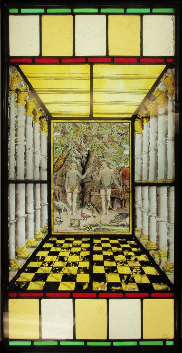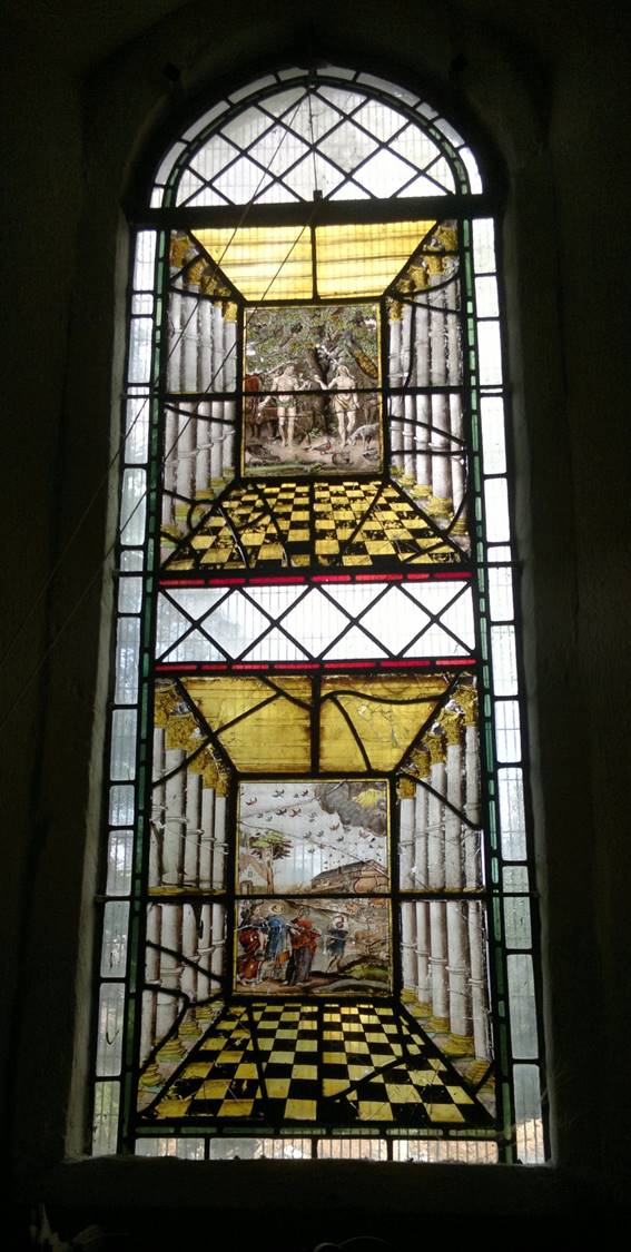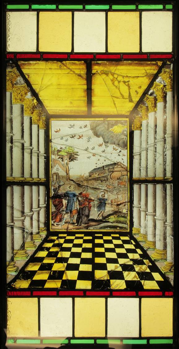 Flemish painted glass as seen in these examples from St Bartholomew's Church, Haslemere, had its origin in the 15th and 16th centuries. Early European mediaeval stained-glass of the Gothic period, with its creation of architectural light and atmosphere within a cathedral setting, is in striking contrast to these small painted glass panels which in their depiction of biblical, heraldic, natural or classical subjects could be termed 'easel' art, better able to explore the human complexities of the Renaissance. The panels were produced in the Low Countries by highly regarded draftsmen and artists (influenced by the work of contemporary artists such as the engravings of Albrecht Durer) throughout the 16th and 17th centuries. This is considered to be the golden age of Flemish painted glass which became a luxury product sold across Europe, destined for the windows of public buildings and private houses alike. Indeed, such glass was itself depicted within the genre paintings of the 17th century Dutch artist Vermeer and his contemporaries.