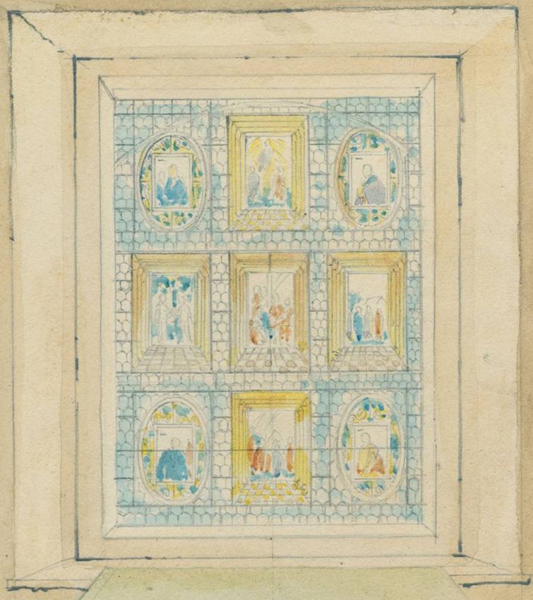 The panels were placed in the East window as can be seen in this painting by E Hassell in 1828.