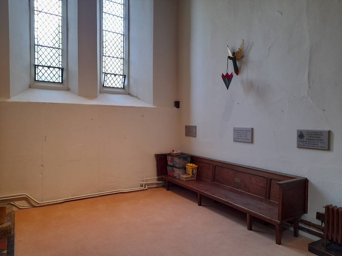 Note also the low bench, designed for children and given in memory of Anne Bridger in 1931 (of Bridger's band)
